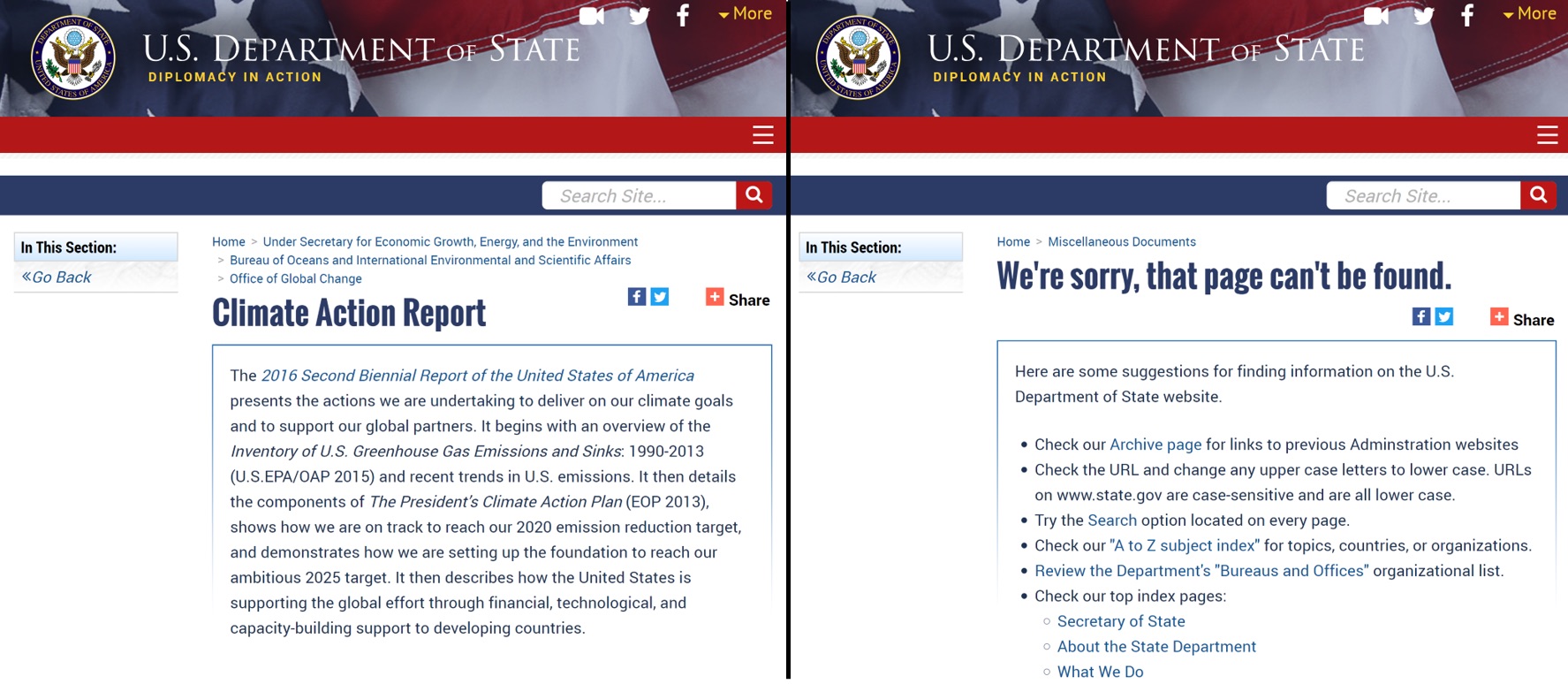 Soon after Mr. Trump’s inauguration, federal websites began downplaying U.S. involvement in international climate action and removing documents pertaining to international agreements. The State Department’s Office of Global Change, for example, updated text and links and removed pages with reports pertaining to climate change. Notably, the 2010, 2014, and 2016 Climate Action Reports were removed from the State Department site (Figure 1).[36] Though the reports are stored in State Department website archives, their former URLs do not redirect to the archived pages’ new URLs, as for the White House pages above, significantly reducing access to the reports. The production of these reports fulfills the U.S. government’s obligation under the United Nations Framework Convention on Climate Change (UNFCCC)[37] to detail actions taken to mitigate effects of climate change. Their removal signals that the administration may pull out of the UNFCCC. Moreover, the removals obscure that such a commitment to the UNFCCC exists in the first place, making it more difficult for citizens to hold the administration accountable for abiding by international treaties and current U.S. government policy.