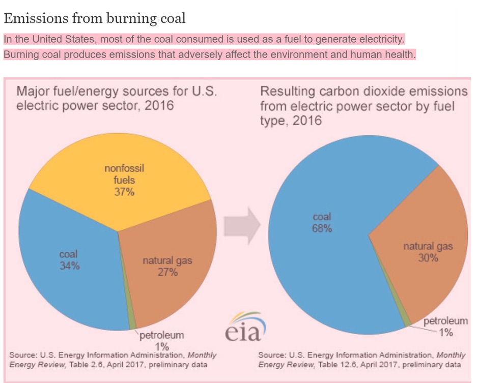 Removal of sentences and graphs and subtle changes to language were observed on the Energy Information Administration’s (EIA) Energy Kids website.[51] On a page discussing coal energy, a plot quantifying CO2 emissions by fuel type was removed, along with the following sentences: “In the United States, most of the coal consumed is used as a fuel to generate electricity. Burning coal produces emissions that adversely affect the environment and human health” (Figure 3). Across the website, the word “impacts” was systematically changed to “effects”, for example: “impacts of coal mining” became “effects of coal mining,” and “reducing the environmental impacts of coal use” was changed to “reducing the environmental effects of coal use.” Importantly, EIA is an independent part of the DOE, meaning its administrator does not need approval from any other government employee, not even the Executive Office, prior to releasing any publication.[52] In fact, after a ProPublica article attributed the changes to the Trump administration, EIA released a press statement explaining their independent position in the government and claiming that there was no external interference.[53]