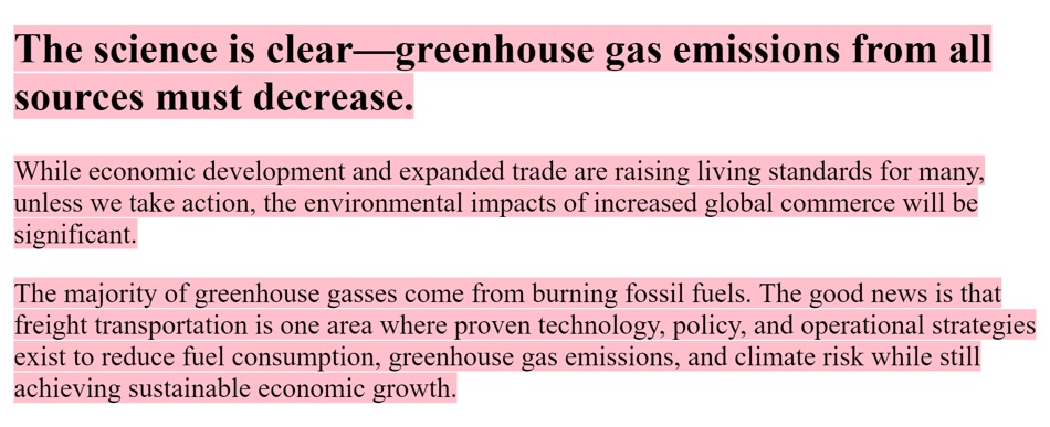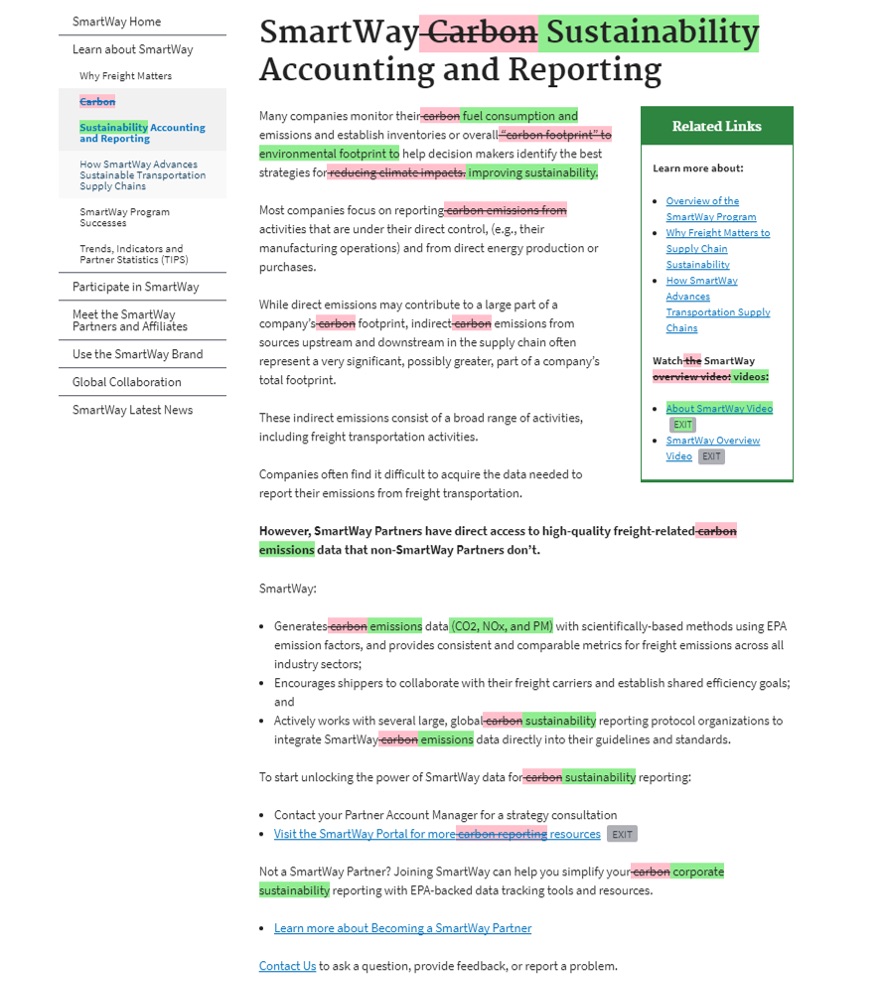 Also at the EPA, climate and emissions language was altered on the website of the SmartWay program, which was established to help companies improve supply chain sustainability by measuring and benchmarking freight transportation emissions. Terms like “sustainability” and “emissions” replaced mentions of “carbon.” A section titled “The science is clear - greenhouse gas emissions from all sources must decrease,” was entirely removed (Figure 4). Descriptions of the EPA’s international work with the United Nations Environment Programme’s Climate and Clean Air Coalition and links to the UN website were also removed (Figure 5).[58]