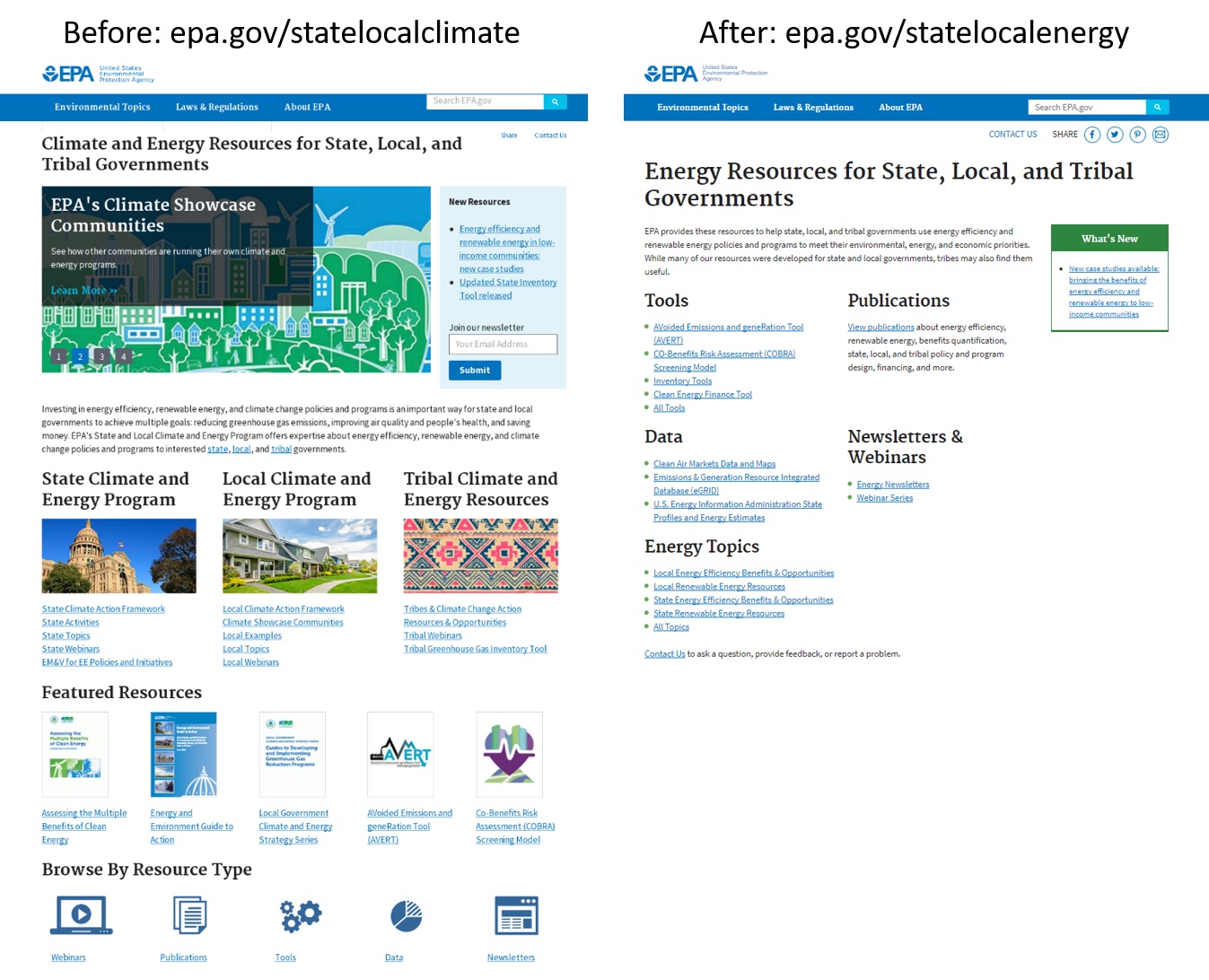 One of the websites removed on April 28 was titled “Climate and Energy Resources for State, Local, and Tribal Governments” and was 380 pages in size (Figure 8). In the first example of returned content, about three months after the removals, a new website titled “Energy Resources for State, Local, and Tribal Governments” was launched, replacing the previous site.[71] Over 200 webpages providing climate information were omitted from the new release and multiple pages, including the homepage, were substantially altered, removing mentions and descriptions of climate and climate change. Some webpages remain unchanged and have been moved from the previous to the new website. For example, all the Web tools, like the AVoided Emissions and geneRation Tool (AVERT), were preserved. Critically, all URLs from the previous website now redirect to the new website’s homepage, which means that links to the previous website have lost their value and specificity.