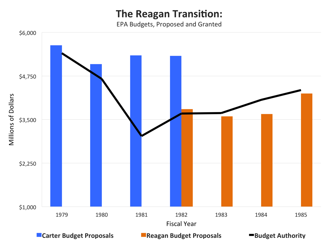 The first part of Reagan’s presidency stands out in the memories of our interviewees as the closest historical precedent to the current Trump administration’s attack on the EPA. That recollection, while less accurate for the EPA’s first 100 days under Reagan, does indeed characterize the entire period of 1981 to 1983, the first two years of his presidency. While Reagan pitched his early efforts to shrink the agency as a departure from Democrat Jimmy Carter, he was also breaking with Republican predecessors. Richard Nixon had actually doubled the agency’s workforce after creating it, and Gerald Ford had overseen a 49% increase in its budget.[7]