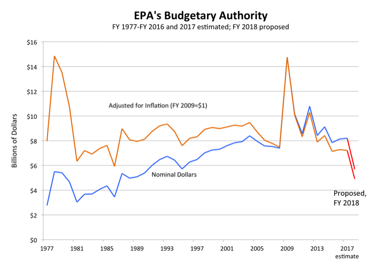 For many inside as well as outside the agency, the loudest alarm bell sounded thus far about the newcomers’ intentions has been the revelation of Trump’s proposed 2018 EPA budget.[84]Leaked to the Washington Post, appearing March 31—like the September 1981 leak of Gorsuch’s budget, only a few months after a new administrator took office—a memo outlined cuts for the EPA that surpassed the 24% proposed for FY 1982 by Reagan (though not approaching the nearly 50% his OMB had wanted).[85]Trump proposed a budget reduction for the agency of 31%, the biggest cut of any major federal agency.
