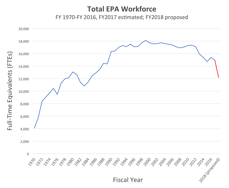 Figure 3: Historical Trends in the EPA’s Workforce. After an early reduction under Reagan during the 1980s, the number of this agency’s employees rose then plateaued. The red line indicates the cut proposed by the Trump administration in the coming fiscal year 2018. Source: EPA, “EPA’s Budget and Spending,” accessed 5/15/2017 at https://www.epa.gov/planandbudget/budget.